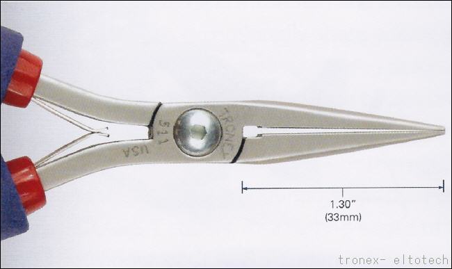 Diese Flachrundzange mit langen, spitzen Backen eignet sich für viele Elektro- und Elektronik- Arbeiten in Produktion und Reparatur. Sie wird auch gerne für feine Schmuckarbeiten verwendet. Die Zange gibt es mit glatten oder geriffelten Spitzen. Die Backenlänge ist ca. 33mm. Die Spitze ist ca. 1,2 x 1,5 mm.