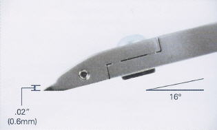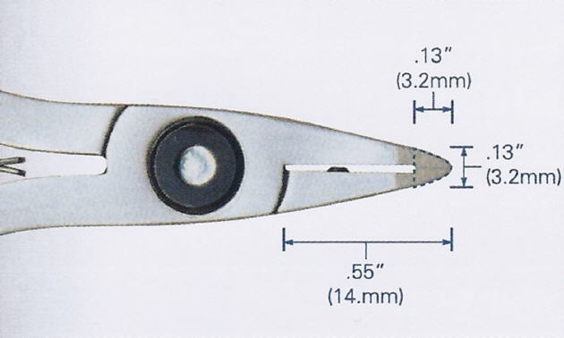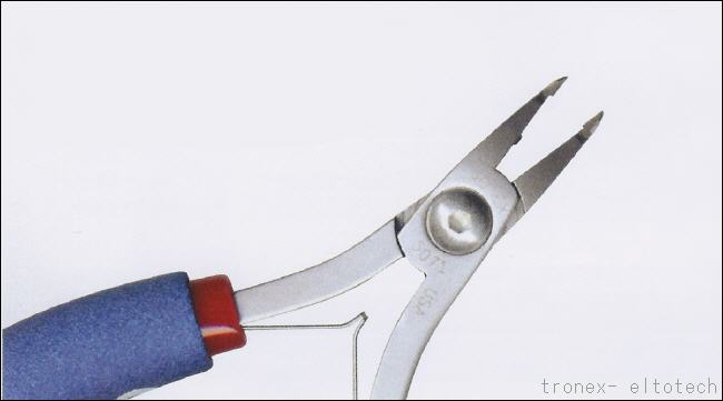 Typischer SMT Cutter. Außerordentlich schmal, feine Schneidekanten mit einer feinen Spitze. Sehr oft verwendet für Arbeiten unter einem Mikroskop. Damit können einzelne Anschlussbeinchen an "fine pitch" Bausteinen abgeschnitten werden. |