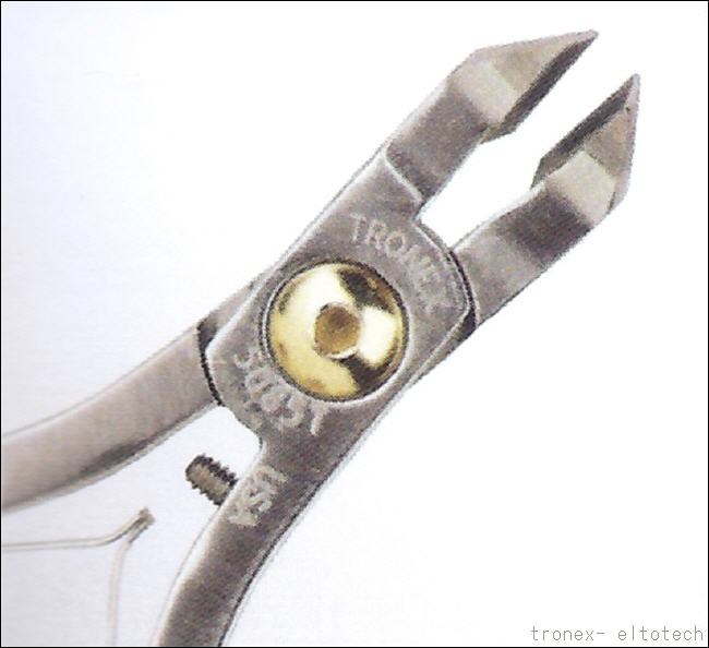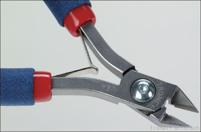 Die Griffe der Schneider bestehen aus zwei Teilen. Der innere, rote Teil hält einen Teil einer Blatt-Feder, die mit der Feder des anderen Griffes den Schneider automatisch öffnet. Dadurch ist ein Ermüdungsfreies Arbeiten möglich. Über diesen inneren roten Kunststoff ist der eigentliche blaue, weiche Griff montiert. Der Schneider ist ESD/EGB sicher. Durch hinein-klicken in das Bild können Sie eine vergrößerte Darstellung erhalten. |