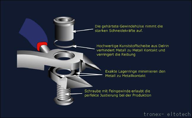 Um die Schneiden vor einer zu starken Schließkraft zu schützen sind in einigen Modellen entweder in den Schneidbacken, oder aber in den Griffen genau justierte Anschlagschrauben montiert. |