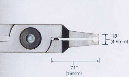 Spezialschneider mit langen sehr schmalen Backen und einem sehr kleinen um 90° abgewinkeltem Schneidekopf. Geeignet für extrem begrenzte Arbeitsbereiche.