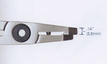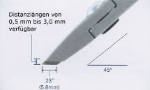 Distanzschneider mit 45 Grad abgewinkelten Schneiden für das Ablängen der Drahtenden auf der Rückseite von elektronischen Platinen. Die Schneider gibt es mit vordefinierten Distanzlängen von 0,5mm bis zu 3,00mm. Eine Anschlagschraube verhindert die Beschädigung der Schneiden.