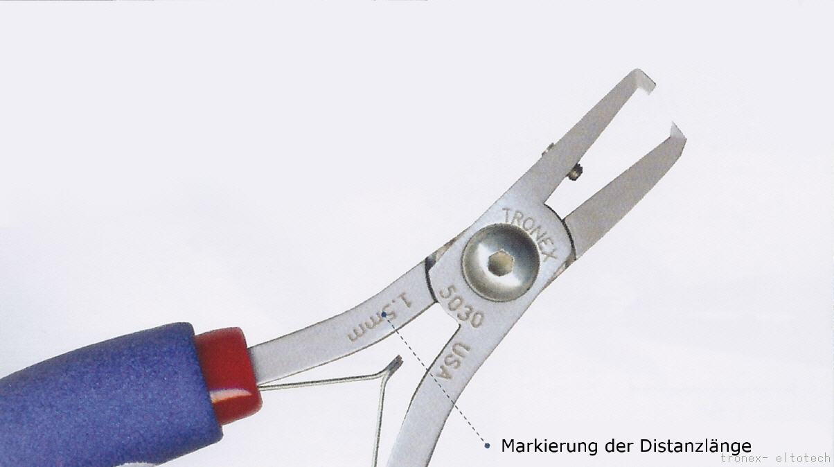 Distanzschneider werden gebraucht, um von bedrahteten elektronische Bauelementen (gemeint sind die auf der Rückseite der Platine überstehenden Drahtenden) auf eine bestimmte vordefinierte Länge zu kürzen. Stellschrauben an einer Seite der Backen verhindern eine zu starkes Anschlagen nach dem Schneiden. Dabei sind Längen von 0,5mm bis 3,0 mm als Standarddistanzen verfügbar.
