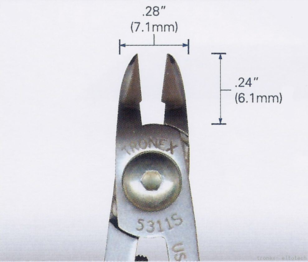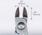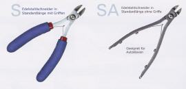 Diese Seitenschneider aus rostfreiem Hochleistungs-Edelstahl 440C haben induktiv gehärtete Schneiden mit einer Härte von 57 - 58 HRC. Eine Edelstahlgewindehülse sowie Edelstahlschrauben und Edelstahl-Blattfedern in den Griffen. Die normale Ausführung ist mit ESD sicheren Kunstsstoffgriffen ausgestattet. Für medizinische Anwendungen müssen die Schneider in Autoklaven sterilisiert werden. Diese Ausführung ist deshalb mit SA gekennzeichnet und hat selbsverständlich keine Kunststoffgriffe. Die Federn sind bei diesen Schneidern wegen der fehlenden Kunststoffgriffe mittels zweier kleiner Edelstahlschrauben an den Stahlgriffen befestigt.