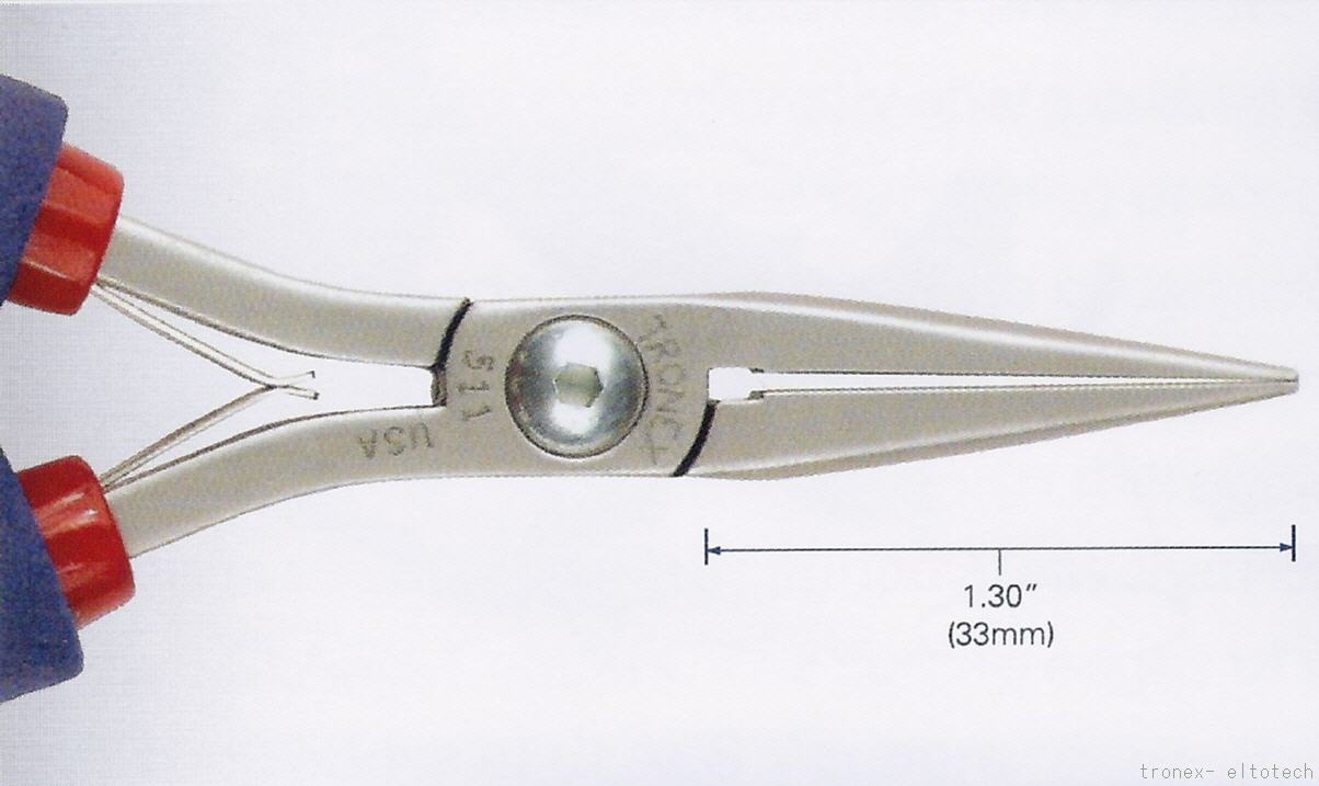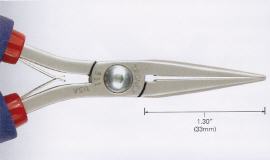 Diese Flachrundzange mit langen, spitzen Backen eignet sich für viele Elektro- und Elektronik- Arbeiten in Produktion und Reparatur. Sie wird auch gerne für feine Schmuckarbeiten verwendet. Die Zange gibt es mit glatten oder geriffelten Spitzen. Die Backenlänge ist ca. 33mm. Die Spitze ist ca. 1,2 x 1,5 mm.
