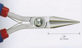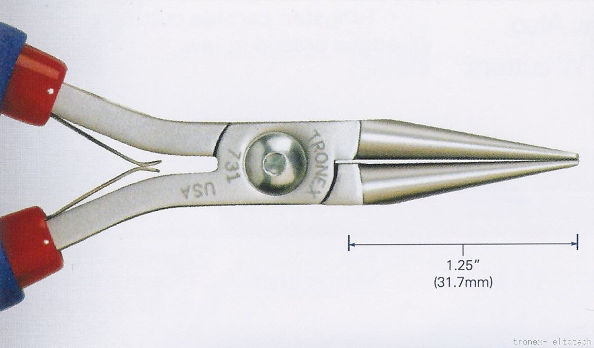 Diese Rundzange mit langen, spitzen Backen eignet sich für viele Elektro- und Elektronik- Arbeiten in Produktion und Reparatur. Sie wird auch gerne für feine Schmuckarbeiten verwendet. Insbesondere wir diese Zangenart verwendet um Ösen zu biegen. Durch die langen Backen können leicht Ösen in verschiedenen Durchmessern gebogen werden. Die Backenlänge ist ca. 31,7 mm. Die Spitze ist ca. 0,9 x 1,8 mm.