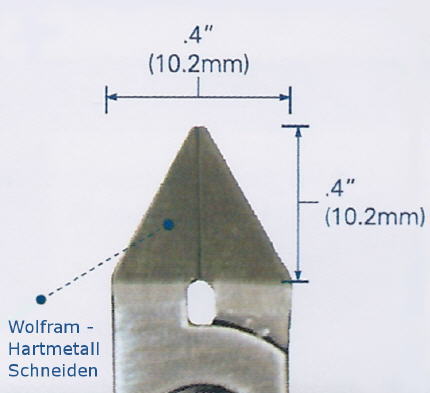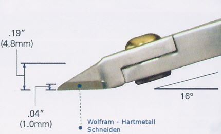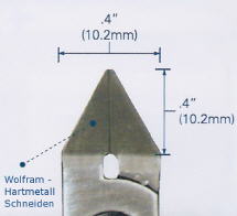 Dieser Schneider hat mit Silberhartlot eingelötete Schneiden aus Wolframkarbid. Sie zeichnen sich durch Ihre sehr hohe Härte von 79 bis 81 HRC aus. Der Kopf und die Schneiden sind Diamantgeschliffen und erhalten so Ihre typische Schärfe. Die spitze Kopfform elaubt das Schneiden von dünnen Stahldrähten bis zu einer Dicke von 0,51 mm.