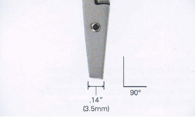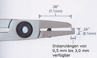 Distanzschneider mit 90 Grad abgewinkelten Schneiden für das Ablängen der Drahtenden auf der Rückseite von elektronischen Platinen. Die Schneider gibt es mit vordefinierten Distanzlängen von 0,5mm bis zu 3,00mm. Eine Anschlagschraube verhindert die Beschädigung der Schneiden. |
